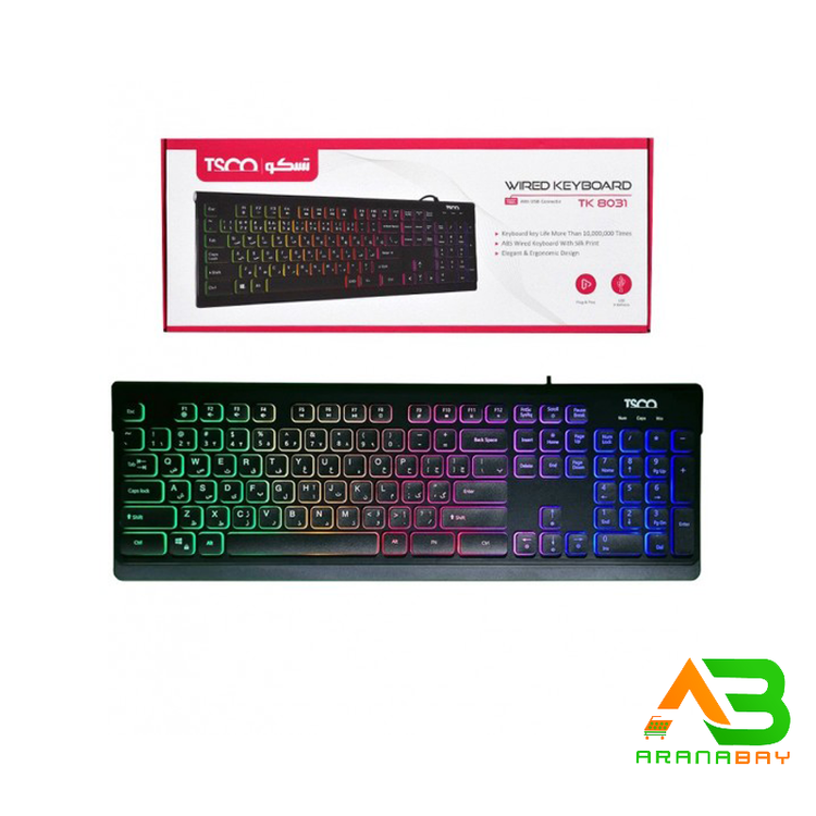 کیبورد TSCO مدل TK 8031 نوع اتصال آن USB و اندازه سیم آن 180 سانتی متر است. این کیبورد همچنین دارای LED رنگی در زیر دکمه های است که زیبایی آن را دوچندان می کند. طراحی اسلیم، سبک و کوچک آن به همراه حروف حک شده با لیزری از دیگر یژگی های کیبورد تسکو به شمار می رود.